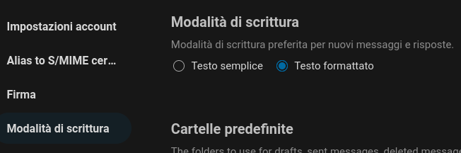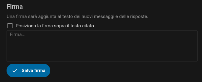 Selezionare la voce Impostazioni account, nella schermata visualizzata posizionarsi nell’area Firma ed inserire le informazioni. La firma può essere in testo semplice oppure formattata. Nel secondo caso è necessario abilitare prima la formattazione come indicato qui , per poi procedere selezionando il testo della firma stessa.